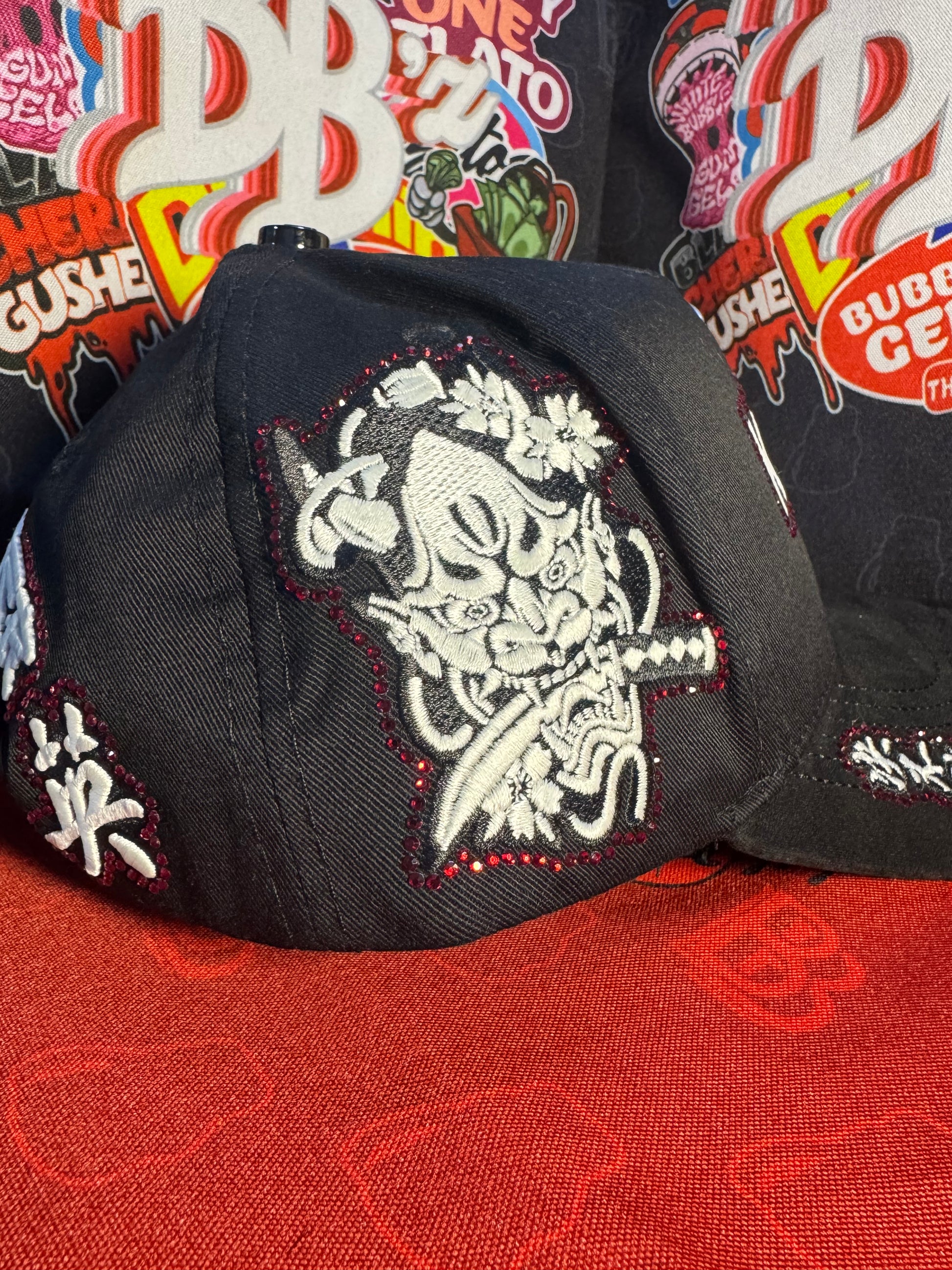 • Laterales y Visera: Incluye bordados detallados de una máscara Oni (demonio japonés), flores de cerezo (Sakura), una espada katana y caracteres Kanji como “貴” (noble) o “不敗” (invicto).