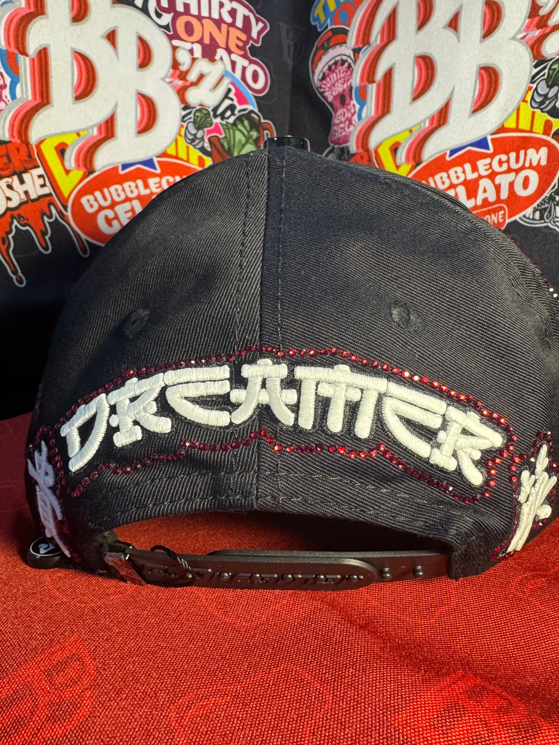• Frontal: Presenta la palabra “KATANA” en bordado blanco, sobre la cual resalta una letra metálica en cromo (estilo “B” o “D”) y está rodeada de cristales o pedrería roja.